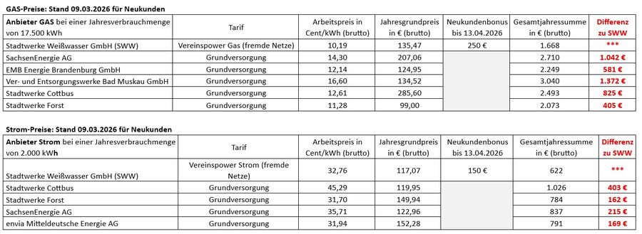 Neukunden erhalten bei einem Abschluss von SWW-Vereinspower Strom 150 €* Bonus und bei Gas sogar 250 € Bonus* – also bis zu 400 € dazu – und das mit einer exklusiven Strompreisgarantie bis 31.12.2026. Im Rahmen der Mindestvertragslaufzeit begrenzt sich diese Preisgarantie auf den Energiekostenanteil, nicht aber auf Netznutzungsentgelte, staatliche Abgaben, Steuern und Umlagen. Der Neukundenbonus wird einmalig ab Lieferbeginn mit der darauffolgenden Jahresrechnung gutgeschrieben. Mindest-Jahresverbrauch: Strom 1.200 kWh / Gas von 7000 kWh.