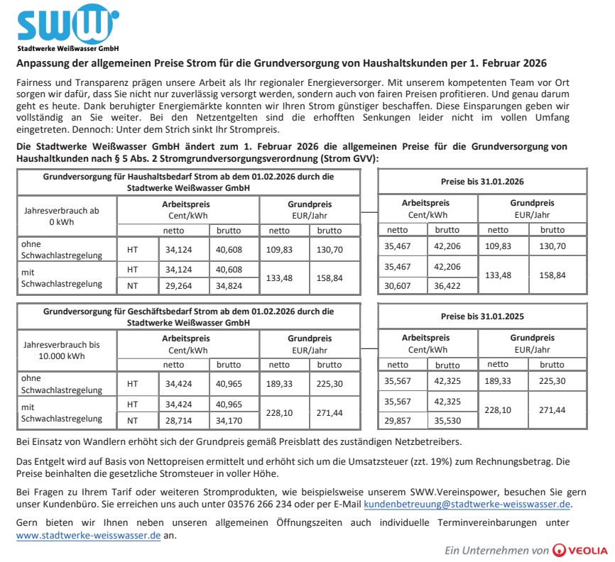 Anpassung der allgemeinen Preise Strom für die Grundversorgung von Haushaltskunden per 1. Februar 2026