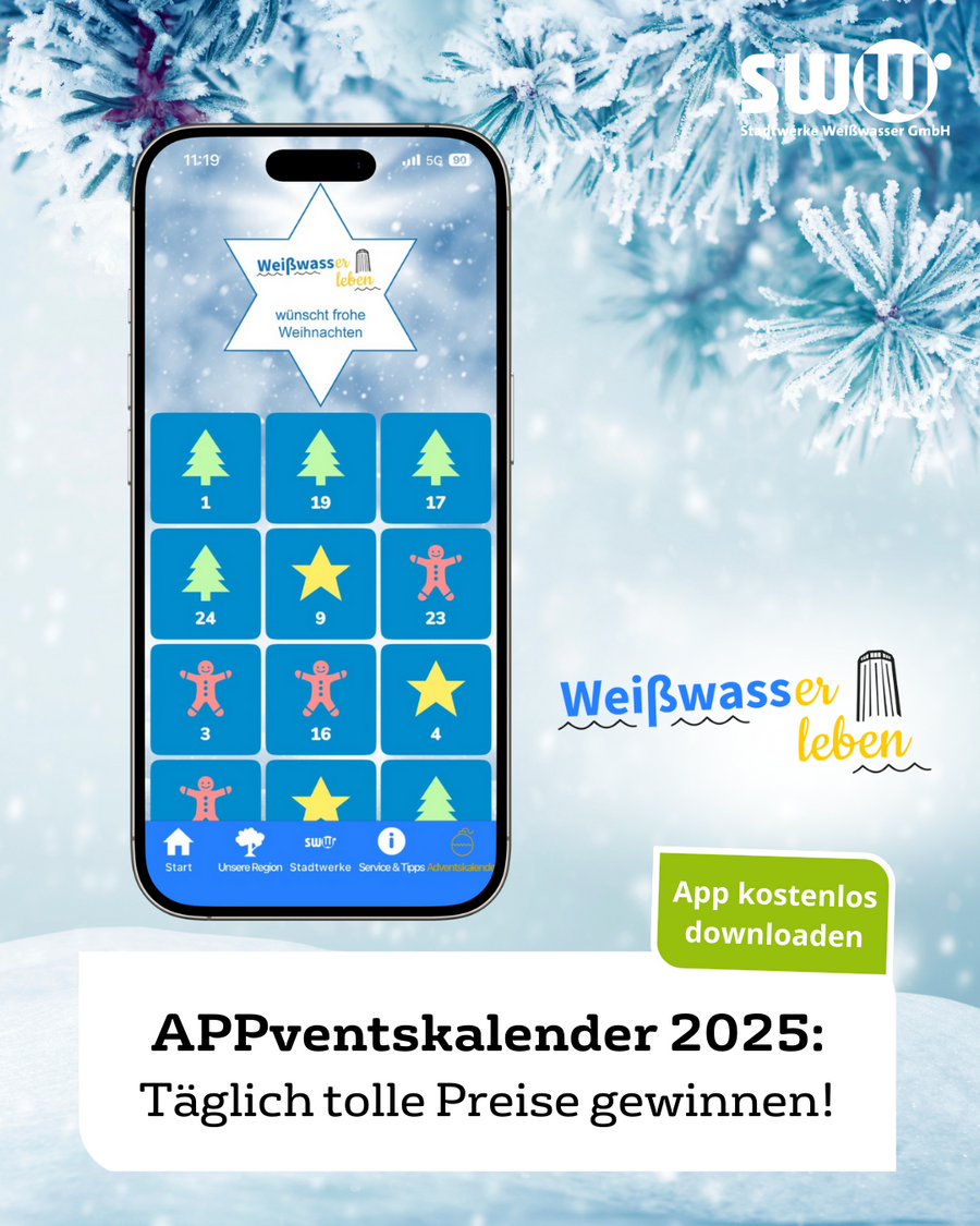 Die von den Stadtwerken Weißwasser betriebene Stadtapp „Weißwasserleben“ versüßt den Bürgerinnen und Bürgern von Weißwasser und Umgebung die Vorweihnachtszeit mit einer besonderen digitalen Aktion. Ab dem 1. Dezember 2025 öffnet sich in der App täglich ein Türchen eines digitalen Adventskalenders, der 24 Tage lang mit attraktiven Überraschungen gefüllt ist.